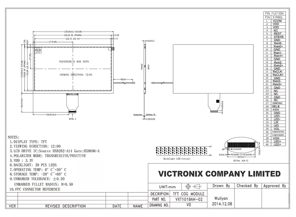 VXT101BAH-02 è un modulo TFT-LCD. È composto da un pannello TFT-LCD, Driver IC, FPC, un'unità di retroscena. L'area di visualizzazione 10.1 contiene 1024 x 600 pixel e può visualizzare i colori fino a 16,7 m. Questo prodotto è conforme al criterio ambientale ROHS