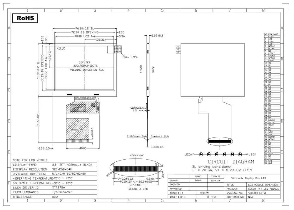 Questo modulo TFT Victronix 320 × 240 QVGA IPS è un modulo LCD TFT da 3,5 pollici ad alte prestazioni progettato per un funzionamento robusto e affidabile in applicazioni industriali e incorporate esigenti. Combinando una forte risoluzione QVGA con prestazioni di colore vibranti e un ampio angolo di visualizzazione, questo modulo offre una chiarezza eccezionale per le interfacce utente, la strumentazione e i sistemi di controllo. Come produttore professionista e fornitore di moduli TFT in Cina, questo modulo TFT da 3,5 pollici Victronix è pienamente conforme agli standard ambientali ROHS, garantendo prestazioni di applicazione superiori. Offriamo un servizio personalizzato per soddisfare le esigenze dei nostri clienti.