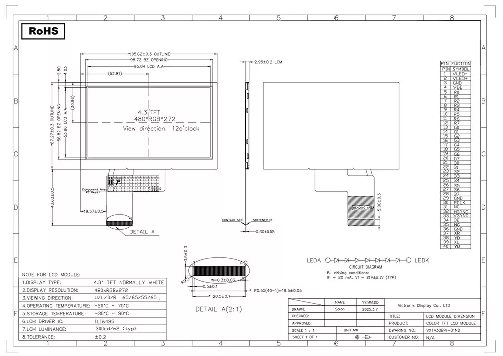 TFT LCD è un tipo di display di cristalli liquidi che utilizza la tecnologia a transistor a film sottile per migliorare la qualità dell'immagine e ha numerose applicazioni nella vita di tutti i giorni. Come produttore e fornitore di moduli TFT professionale in Cina, cosa rende il modulo TFT industriale Victronix 480 × 272 diverso dagli altri produttori? In primo luogo, offre una tipica luminosità di 300cd/m², un ampio angolo di visione di 65 ° nella direzione delle 12 e un rapporto di contrasto di 700: 1, garantendo un'eccellente leggibilità da vari angoli. In secondo luogo, integra un'unità di retroilluminazione utilizzando LED bianchi 7S1P con una durata tipica da 30.000 a 50.000 ore (al 50% di luminosità iniziale), garantendo una chiara visibilità in tutte le condizioni di illuminazione. Inoltre, supporta un'interfaccia RGB con il controller ILI6485. Inoltre, supera rigorosi test ambientali, inclusi shock termico (-30 ° C ↔ +80 ° C), conservazione dell'umidità (60 ° C/90% di RH) e vibrazioni meccaniche, garantendo che possa funzionare perfettamente attraverso un intervallo di temperatura esteso (-20 ° C a +70 ° C).