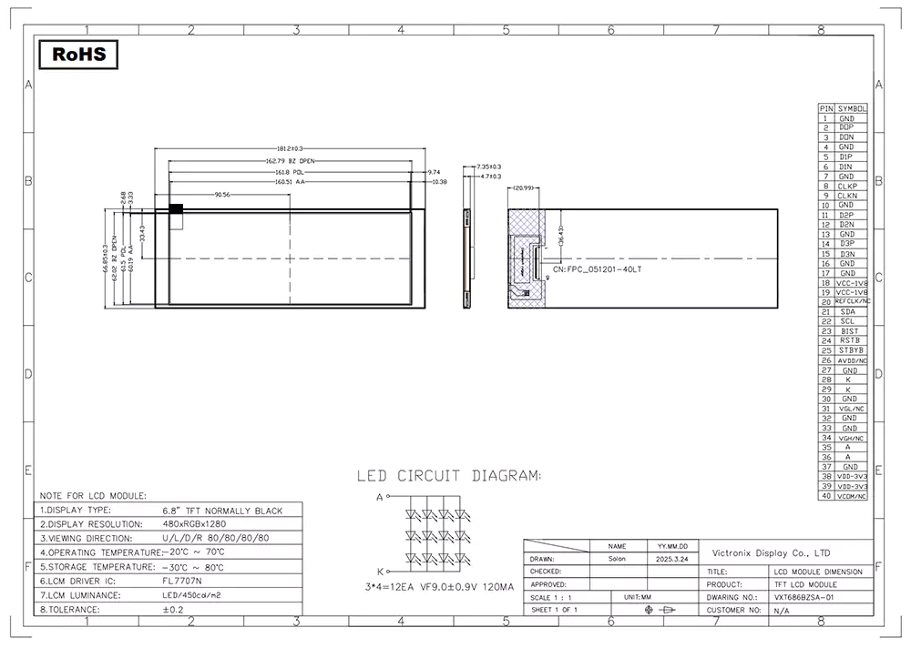 TFT LCD è un tipo di display di cristalli liquidi che utilizza la tecnologia a transistor a film sottile per migliorare la qualità dell'immagine e ha numerose applicazioni nella vita di tutti i giorni. Come produttore e fornitore di moduli TFT professionale in Cina, cosa rende il modulo TFT IPS Victronix da 6,86 pollici 480 × 1280 diverso dagli altri produttori? Inizialmente, offre una luminosità tipica di 450cd/m², colori di 16,7 m, un ampio angolo di visione di 80 ° (tipico) in tutte le direzioni e un rapporto di contrasto di 800: 1, garantendo un'eccellente leggibilità da vari angoli. In secondo luogo, integra un'unità di retroilluminazione utilizzando LED bianchi 3 × 4 con una durata tipica da 30.000 a 50.000 ore (al 50% di luminosità iniziale), garantendo una chiara visibilità in tutte le condizioni di illuminazione. Inoltre, utilizza un'interfaccia DSI MIPI a 4 corsie per il trasferimento di dati ad alta velocità e l'integrazione semplificata. Inoltre, supera rigorosi test ambientali, inclusi la conservazione e il funzionamento a temperatura ad alta/bassa, il ciclo della temperatura, il calore umido (umidità) in modo che possa funzionare perfettamente attraverso un intervallo di temperatura esteso da -20 ° C a +70 ° C.