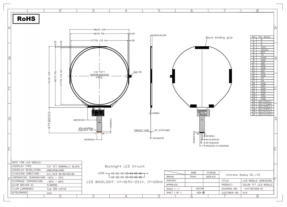 Il modulo TFT può essere trovato ovunque nella vita. Cosa rende questo Victronix da 7 pollici 1080 × 1080 round IPS TFT LCD diverso dagli altri produttori? Inizialmente, la sua luminosità CD/m² di 500, il rapporto di contrasto 800: 1 e gli angoli di visualizzazione di 80 ° in tutte le direzioni assicurano immagini vivide. In secondo luogo, il dispositivo supporta un'interfaccia MIPI a 4 corsie con il controller FL5893DC per il trasferimento di dati ad alta velocità. Inoltre, presenta una retroilluminazione a LED bianca con una durata di vita da 30.000 a 50.000 ore, garantendo prestazioni affidabili in varie applicazioni industriali. Inoltre, soddisfa gli standard ROHS e supera rigorosi test di affidabilità (shock termico, umidità, conservazione) per funzionare perfettamente a temperature estreme (da -20 ° C a +70 ° C) e resistere a condizioni di conservazione dure (da -30 ° C a +80 ° C).