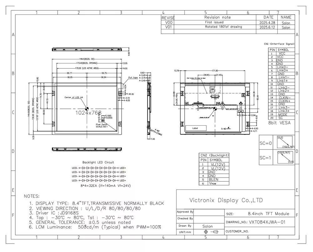 TFT LCD è un tipo di display di cristalli liquidi che utilizza la tecnologia a transistor a film sottile per migliorare la qualità dell'immagine e ha numerose applicazioni nella vita di tutti i giorni. Come produttore e fornitore di moduli TFT professionale in Cina, cosa rende il Victronix 8,4 pollici 1024 × 768 IPS TFT LCD diverso dagli altri produttori? In primo luogo, offre una tipica luminosità di 500 CD/m², angoli di visione larga 85 ° di tutte le direzioni e un rapporto di contrasto di 1500: 1, garantendo un'eccellente leggibilità da vari angoli. In secondo luogo, integra un'unità di retroilluminazione utilizzando 32 LED bianchi con una durata tipica di 50.000 ore (al 50% di luminosità iniziale), garantendo una chiara visibilità in tutte le condizioni di illuminazione. Inoltre, supporta l'interfaccia LVDS con la protezione ESD e il controller JD9168S. Inoltre, supera rigorosi test ambientali, inclusi shock termico (-30 ° C ↔ +80 ° C di cicli), accumulo di umidità (60 ° C/90% di RH) e vibrazioni meccaniche, garantendo che possa funzionare perfettamente attraverso un intervallo di temperatura esteso (-30 ° C a +80 ° C).